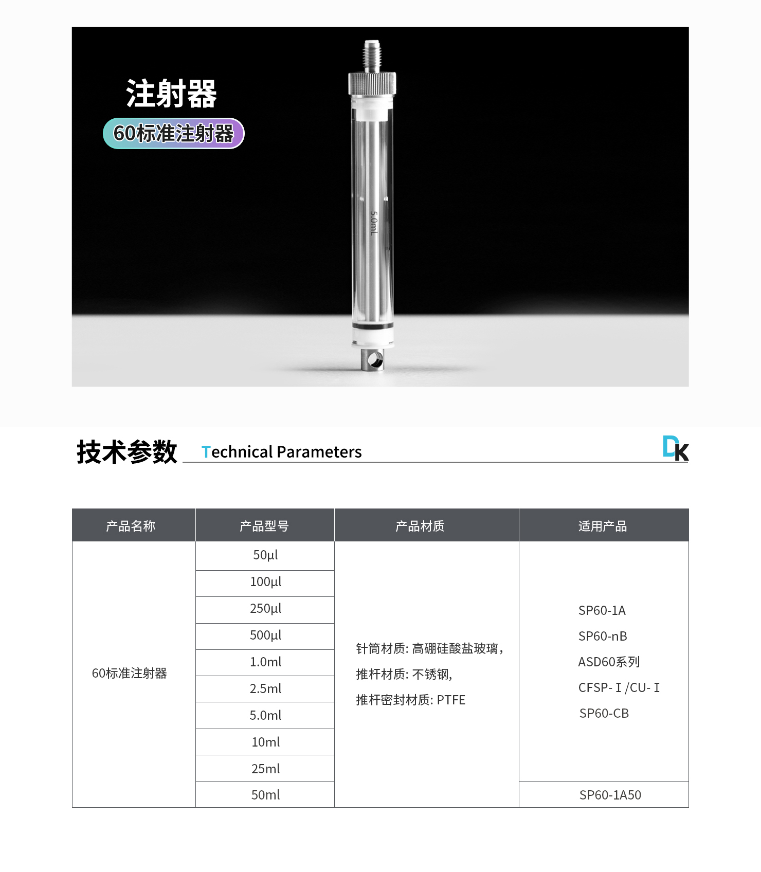 注射器材質(zhì):針筒材質(zhì): 高硼硅酸鹽玻璃, 推桿材質(zhì): 不銹鋼, 推桿密封材質(zhì): PTFE